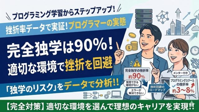 プログラミング独学の挫折率は約90%というデータがあります(CloudInt)。一方、スクールやエージェントを活用した場合の挫折率は3〜8%程度です。独学にこだわりすぎると、時間だけが過ぎてしまうリスクがあります。